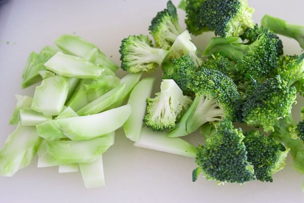 Prepare the broccoli by peeling the fibrous layer of skin off the main stalk. If you are using a vegetable peeler you'll need to go over the same area several times to get through to the tender center. Cut the peeled stalk off and slice it in half lengthwise and then into bite-sized strips. Cut apart the florets into bite-sized pieces.