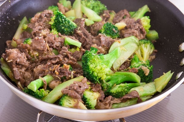 Remove the lid and return the beef to the pan. The potato starch has probably settled, so give the sauce mixture a stir and pour it in with the beef and broccoli.